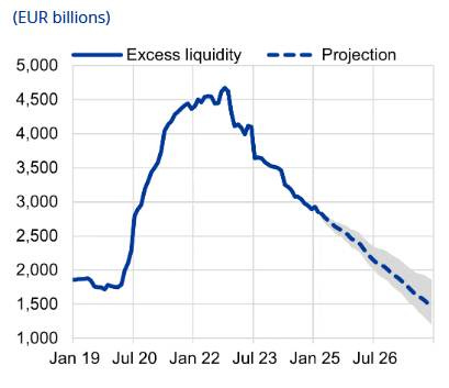 In March 2023, the ECB started reducing its balance sheet by not reinvesting the securities purchased under various QE programmes. The following chart shows the reduction of excess bank reserves that has been implemented and is forecasted to continue until the end of next year.